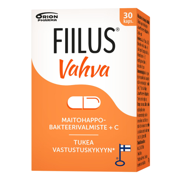 Fiilus Vahva +C sisältää yhdessä kapselissa Lacticaseibacillus rhamnosus GG -maitohappobakteereja 10 miljardia kappaletta. Kapselissa on myös 20 mg C-vitamiinia, joka tukee vastustuskykyä*. Valmisteen annostelu on helppoa: kasviperäinen kapseli voidaan ottaa joko sellaisenaan, tai avata ja sekoittaa esimerkiksi juomaan tai ruokaan. C-vitamiini näkyy läpinäkyvässä kapselissa pieninä punertavina pisteinä.