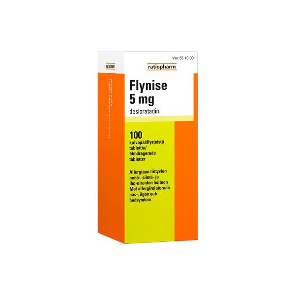 Flynise on allergialääke. Flynise sisältää desloratadiinia, joka lievittää allergiseen nuhaan liittyviä oireita (mm. aivastelu,nenän vuotaminen tai kutina, kitalaen kutina sekä silmien kutina, punoitus tai vuotaminen) ja nokkosihottumaa. Ei alle 12-vuotiaille.
