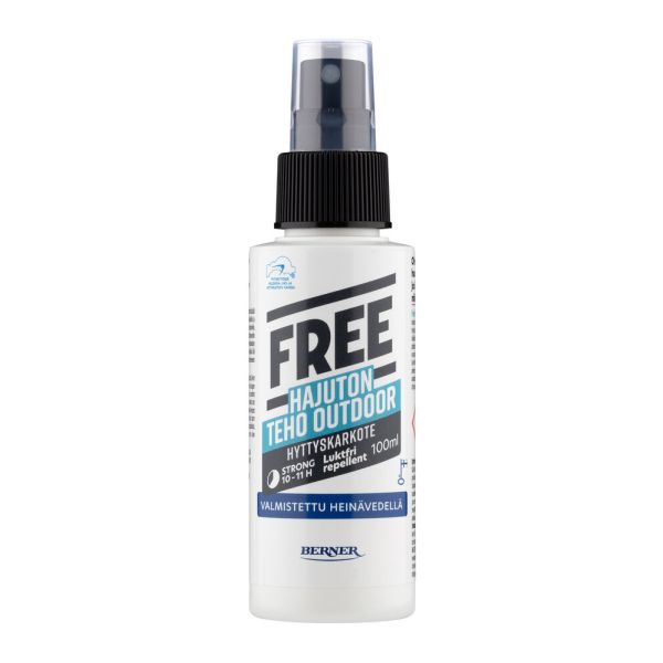 Free Teho Outdoor hajuton hyttyskarkote antaa tehokkaan 10-11 tunnin suojan hyttysiä, punkkeja ja paarmoja vastaan.