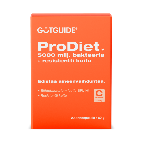GutGuide®ProDiet-bakteeri- ja kuitulisä on patentoidun Bifidobacterium lactis BPL1® -bakteerikannan, C-vitamiinin ja resistentin maissikuidun yhdistelmätuote, joka tukee energia-aineenvaihduntaa. Dieetti eli ruokavalio vaikuttaa painonhallintaan, mutta myös suolistomikrobiston tasapainolla on todettu yhteys energiametaboliaan ja viskeraalisen rasvan kertymisen riskiin. Resistentti maissikuitu kulkee hajoamatta paksusuoleen hyödyllisten bakteerien ravinteeksi lisäten kylläisyyden tunnetta. C-vitamiini edistää normaalia energia-aineenvaihduntaa.