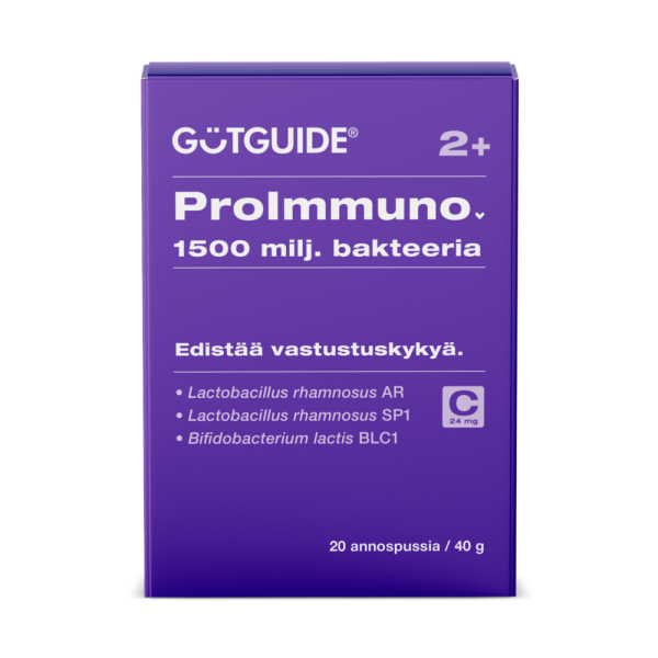 GutGuide®ProImmuno2+ on kolmen bakteerikannan, Lactobacillus rhamnosus AR/CRL 1505, Lactobacillus rhamnosus SP1, Bifidobacterium lactis BLC1 ja C-vitamiinin* yhdistelmätuote, joka tukee vastustuskykyä suoliston kautta. *C-vitamiini edistää immuunijärjestelmän normaalia toimintaa.