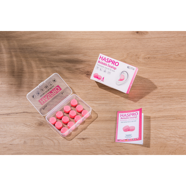 Återanvändbara och lättformade och mjuka Haspro Mold öronproppar. Ljuddämpning SNR: 27 dB.