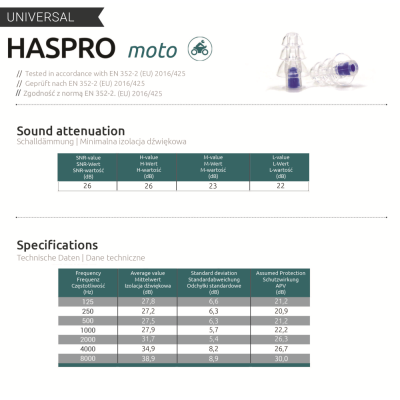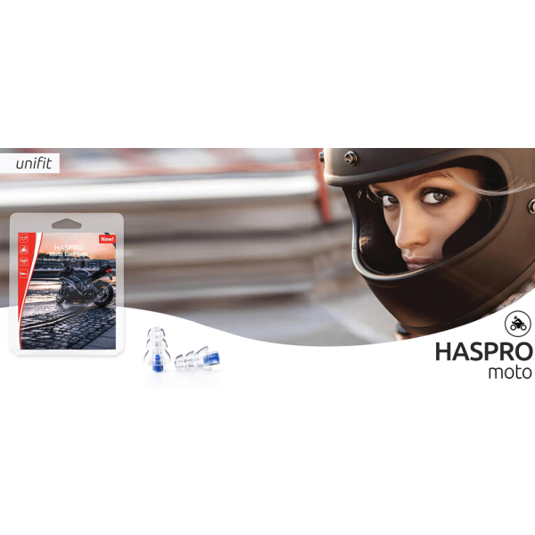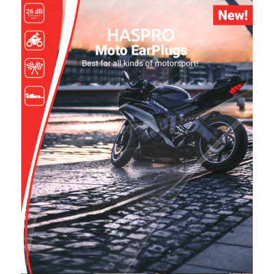 Haspro Moto Earplugs – Suunniteltu suojaamaan kuuloa moottoripyörällä ajettaessa. Kevyet ja äänettömät korvatulpat käyttää. Vähentävät tuulen aiheuttamaa melua, mutta antavat moottoriäänten ja liikenteen signaalien kuulua. Äänenvaimennus SNR: 26 dB.