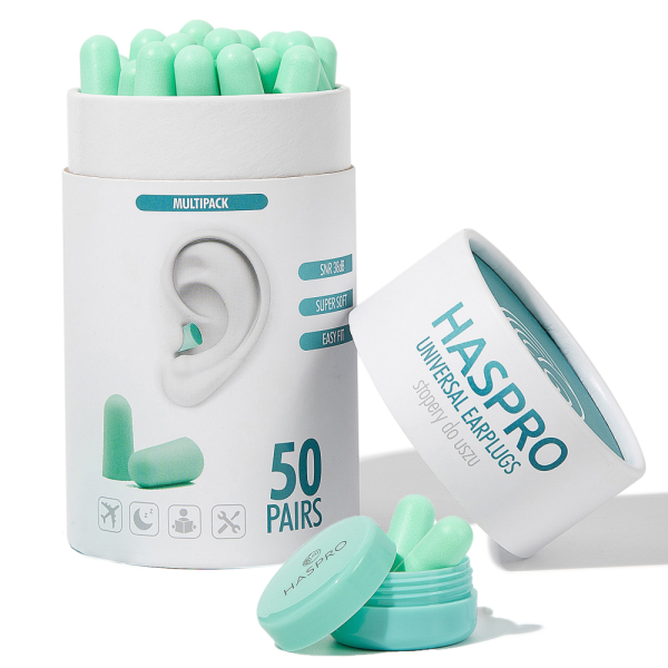 50 par (=100 st.) öronproppar för engångsbruk för att skydda mot det skadliga ljudet. Tillverkad av mycket mjukt polyuretanskum. Haspro Universal-öronproppar är designade för att passa varje användares hörselgång. Hög ljuddämpning SNR: 38 dB. Användningsändamål: Att skydda mot det skadliga ljudet. Dosering: Innan du sätter i öronpropparna, se till att de är rena. Dra upp örat med motsatt hand för att räta ut hörselgången. Ta tag i den rena öronproppen med den andra handen och sätt försiktigt in i hörselgången. Sätt inte in öronproppar för djupt i hörselgången, för det gör ont. Sätt alltid i och ta bort öronproppar med försiktighet för att förhindra skador på örat. Material: Polyuretanskum. Tekninska uppgifter: Modell: EPUF-5. Ljuddämpning SNR: 38 dB. Överensstämmelse: (EU) 2016/425, EN 352:2002. CE2834. Anmält organ: CCQS. Tillverkare: HASPRO, Rzeszów, Poland info@hasproearplugs.com. Produkten innehåller bruksanvisningar på finska och svenska. Bör observeras: Värdena i tabellen r