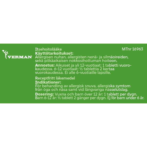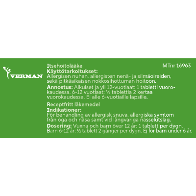 - kausiluonteiseen ja ympärivuotiseen allergiseen nuhaan liittyvien nenä- ja silmäoireiden hoitoon