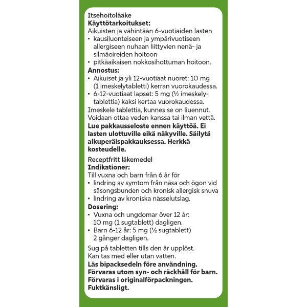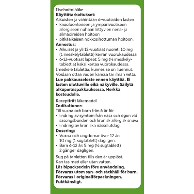 - kausiluonteiseen ja ympärivuotiseen allergiseen nuhaan liittyvien nenä- ja silmäoireiden hoitoon