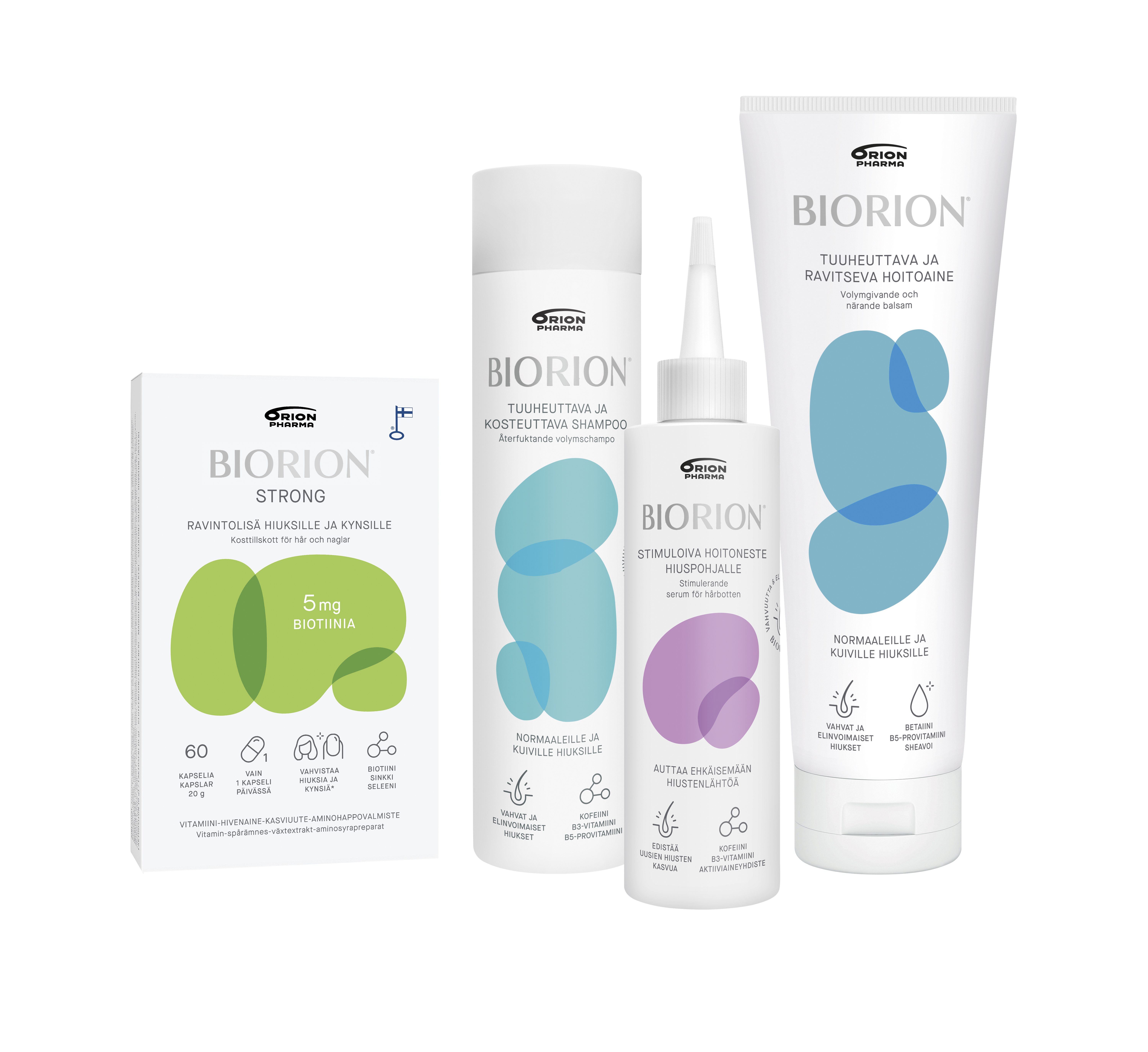 Monipuolinen Biorion-tuotesarja on kehitetty hiustesi hyvinvoinnin tueksi. Kokeile Biorion Strong -ravintolisää, joka sisältää hiusten hyvinvointia tukevaa biotiinia ja testaa myös tuuheuttavaa shampoota ja hoitoainetta. Ruskeille ja vaaleille hiuksille omat pigmenttiä sisältävät shampoot ja hoitoaineet. Auttaa säilyttämään hiusten sävyn intensiivisenä. Täydennä hiustenhoitorutiinisi hiuspohjaa stimuloivalla hoitonesteellä.