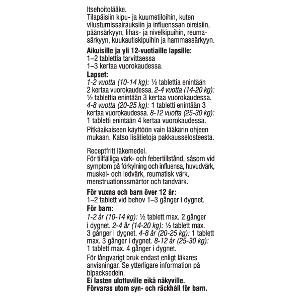 Itsehoidossa tilapäisten kipu- ja kuumetilojen hoidossa aikuisille ja yli 12-vuotiaille lapsille tabletteja yleensä 200-400 mg 1-3 kertaa päivässä.