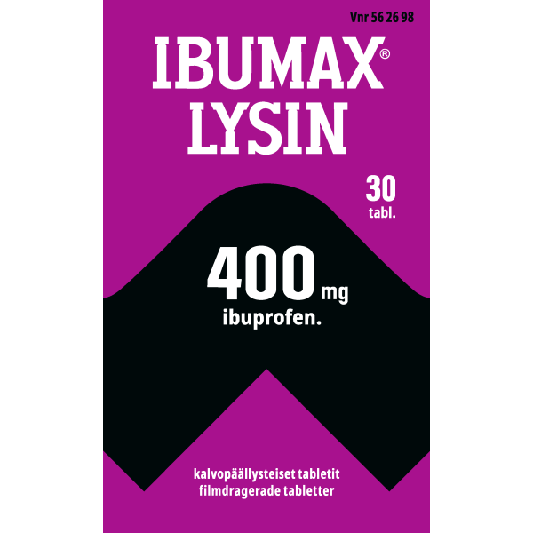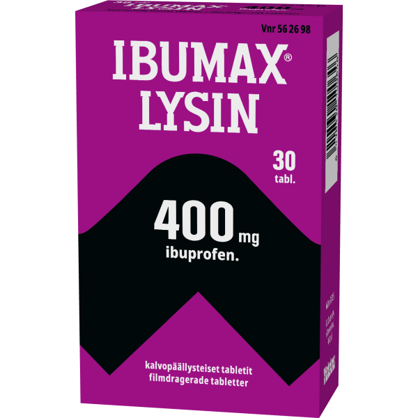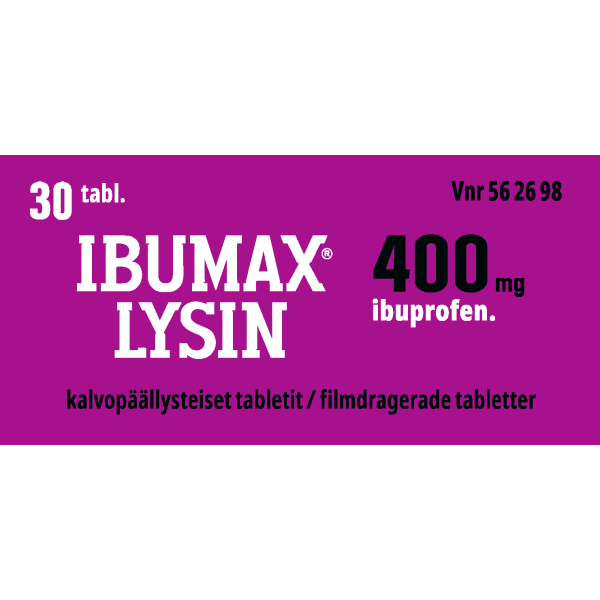 bumax Lysin kalvopäällysteiset tabletit sisältävät 684 mg ibuprofeenilysiiniä, mikä vastaa 400 mg ibuprofeenia. Tämä ibuprofeenin suolamuoto vaikuttaa nopeasti ja tarjoaa tehokkaan avun kivun ja kuumeen hoitoon. Tabletit ovat laktoosittomia, gluteenittomia ja vegaanisia.