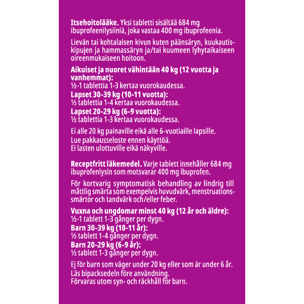 ½-1 tablettia (200-400 mg) 1-3 kertaa vuorokaudessa. Enintään 3 tablettia (1200 mg) vuorokaudessa.