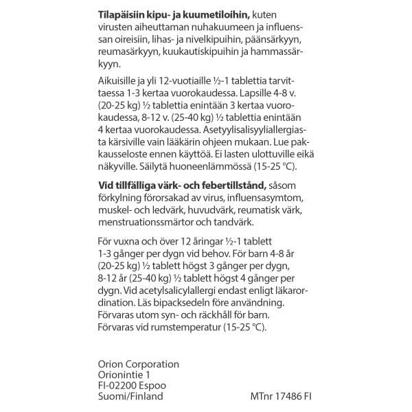 Aikuisille ja yli 12-vuotiaille nuorille puolikas tai kokonainen tabletti 1-3 kertaa päivässä. 4-8-vuotiaille, 20-25 kg painaville lapsille puolikas tabletti enintään kolme kertaa päivässä, ja 8-12-vuotiaille, 25-40 kg painaville lapsille puolikas tabletti enintään neljä kertaa päivässä.