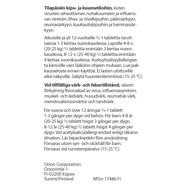 Aikuisille ja yli 12-vuotiaille nuorille puolikas tai kokonainen tabletti 1-3 kertaa päivässä. 4-8-vuotiaille, 20-25 kg painaville lapsille puolikas tabletti enintään kolme kertaa päivässä, ja 8-12-vuotiaille, 25-40 kg painaville lapsille puolikas tabletti enintään neljä kertaa päivässä.