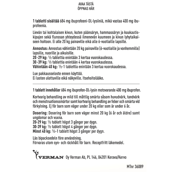 Suositeltu annos on aikuisille ja vähintään 12-vuotiaille nuorille 200-400 mg (1/2-1 tablettia) kolme kertaa päivässä.