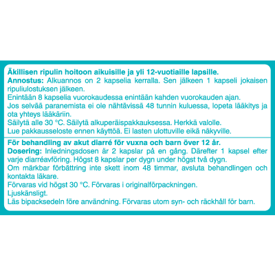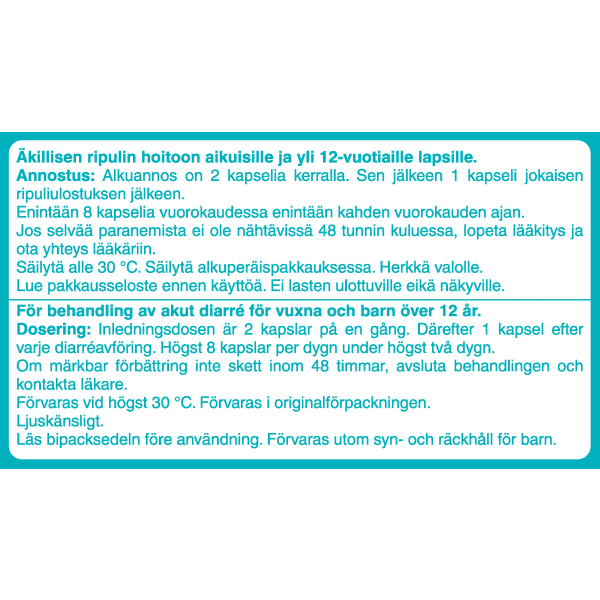 Annostus äkillisessä ripulissa aikuisille ja yli 12-vuotiaille lapsille: Alkuannos on 2 kapselia (4 mg). Tämän jälkeen otetaan 1 kapseli (2 mg) jokaisen ripuliulostuksen jälkeen, kunnes riittävä hoitovaste saavutetaan. Enimmäisannos on 8 kapselia (16 mg) vuorokaudessa. Alle 12-vuotiaille lapsille ja pitkäaikaiseen käyttöön vain lääkärin ohjeen mukaan. Lääkettä ei tule antaa alle 6-vuotiaille lapsille.