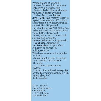 b Silloin, kun ei käytetä päivittäin D-vitaminoituja maitovalmisteita, rasvalevitteitä ja/tai kalaa (loka-maaliskuu). Tämän lisäksi tavoiteltavan seerumipitoisuuden saavuttamiseksi hyvin vähän ulkona oleskeleville, peitetysti pukeutuville ja tummaihoisille suositellaan 10 tippaa (20 mikrog) /vrk ympäri vuoden.