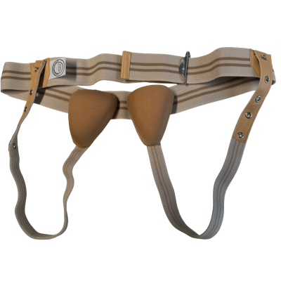 Bältet spänns åt stegvis med hake och ring. Bråckbandage för ljumskbråck. Håller in bråcket och reducerar smärta med sina stadiga pelotter.