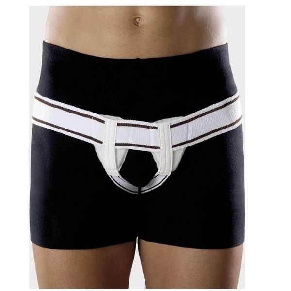 Bältet spänns åt stegvis med hake och ring. Bråckbandage för ljumskbråck. Håller in bråcket och reducerar smärta med sina stadiga pelotter.
