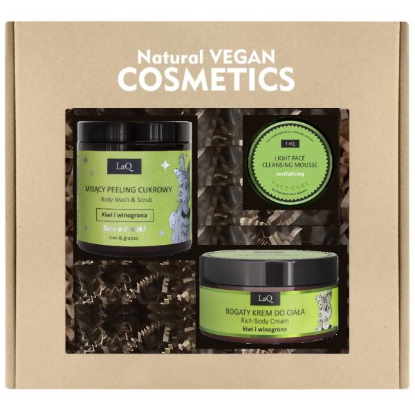 LaQ Kiwi and Grapes Pesu- ja kuorinta Wash and Scrub 220 g: Levitä pieni määrä tuotetta kostealle iholle, hiero pyörivin liikkein, kunnes muodostuu vaahtoa, huuhtele sitten huolellisesti vedellä.