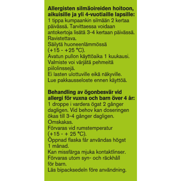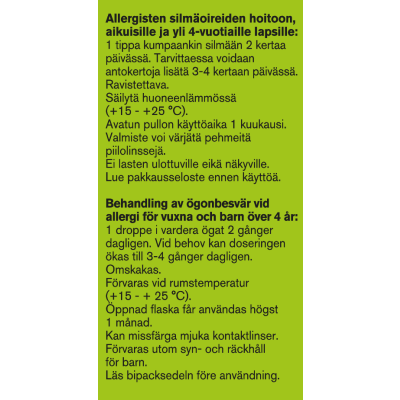 Aikuisten ja yli 4-vuotiaiden lasten annostus on tavallisesti 1 tippa kumpaankin silmään 2 kertaa vuorokaudessa. Tarvittaessa voidaan nostaa annokseen 1 tippa kumpaankin silmään 3-4 kertaa vuorokaudessa. Alle 4-vuotiaille lapsille vain lääkärin määräyksellä.