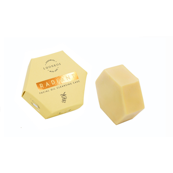 Luonkos-öljypuhdistuskakku on 4–in–1-tuote joka puhdistaa ihon, poistaa meikin sekä tasapainottaa ja hoitaa ihoasi. Erityisesti herkälle ja kuivalle iholle suunniteltu Radiant puhdistaa sekä hoitaa ihoa. Kermainen koostumus poistaa meikit lempeän tehokkaasti. Tyrni sisältää mm. B-, E-, ja C-vitamiineja, jotka vahvistavat ihoa ja nopeuttavat sen elpymistä. Sheavoi hoitaa ja pehmentää ihoa tehden siitä joustavan, jolloin se on vahvempi ulkoisia rasituksia vastaan. Aprikoosinkiviöljy on ihoa ravitseva ja hoitava öljy. Kookosöljy ja kaakaovoi auttavat meikin sekä lian poistamista iholtasi.