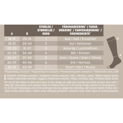 Jotta sukka toimii oikein, valitse omia mittojasi parhaiten vastaava koko. Löydät kokotaulukon pakkauksesta ja kuvasta. Koko ilmoitetaan varvassauman värillä
