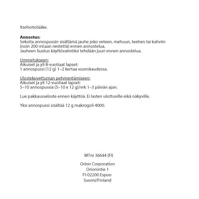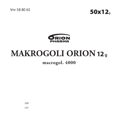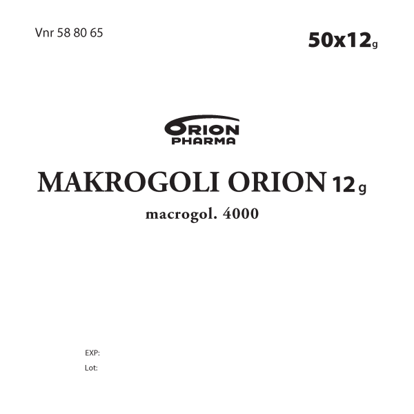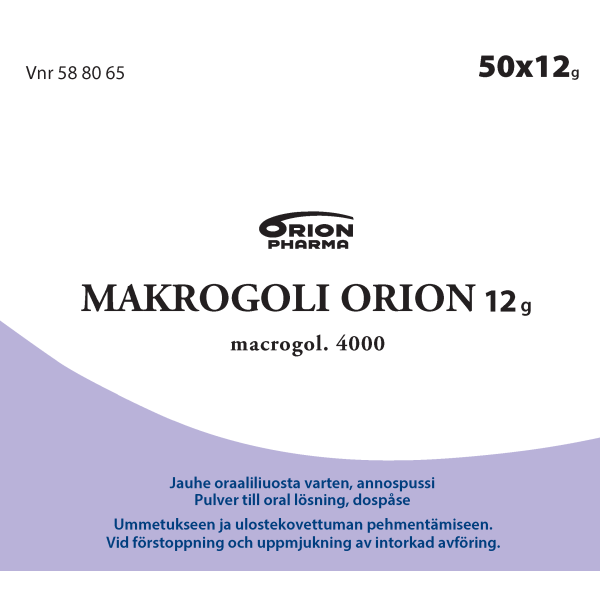 Makrogoli Orion 12 g jauhe oraaliliuosta varten on ummetuksen hoitoon sekä kuivuneen, suolessa pitkään olleen ulostemassan (ulostetukkeuma) pehmentämiseen tarkoitettu valmiste. Vaikuttava aine makrogoli 4000 sitoo vettä, jolloin suolen sisällön vesimäärä lisääntyy ja ulostemassa pehmentyy.