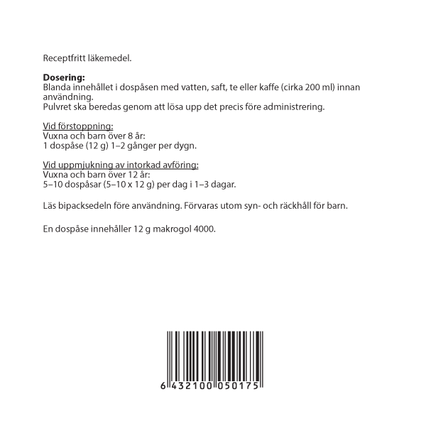 Tavallinen annos ulostekovettuman pehmentämiseen aikuisille ja yli 12-vuotiaille lapsille on 5-10 (12 g) annospussia eli 1-2 litraa vuorokaudessa, 1-3 vuorokauden ajan.