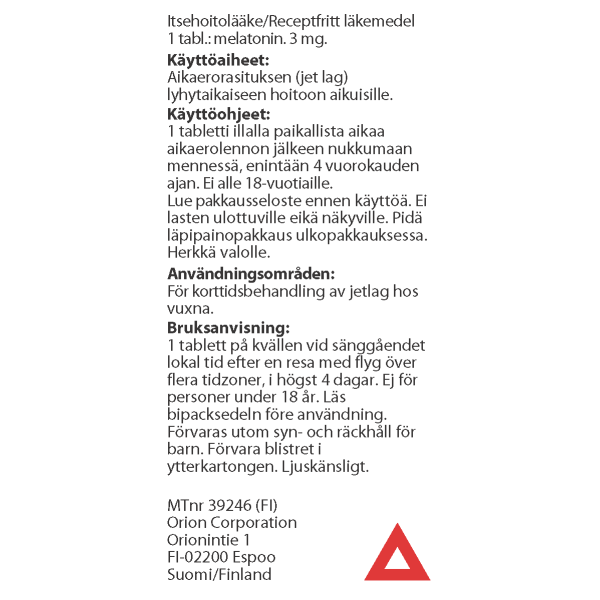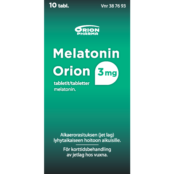 Melatonin Orion on itsehoitolääke aikaerorasituksen (jet lag) lyhytaikaiseen hoitoon aikuisille. Melatonin Orion sisältää vaikuttavana aineena melatoniinia, joka kuuluu elimistön luonnollisesti tuottamiin hormoneihin ja auttaa säätelemään elimistön uni-valverytmiä. Tabletin voi tarvittaessa murskata ja sekoittaa kylmään veteen ennen sen ottamista.