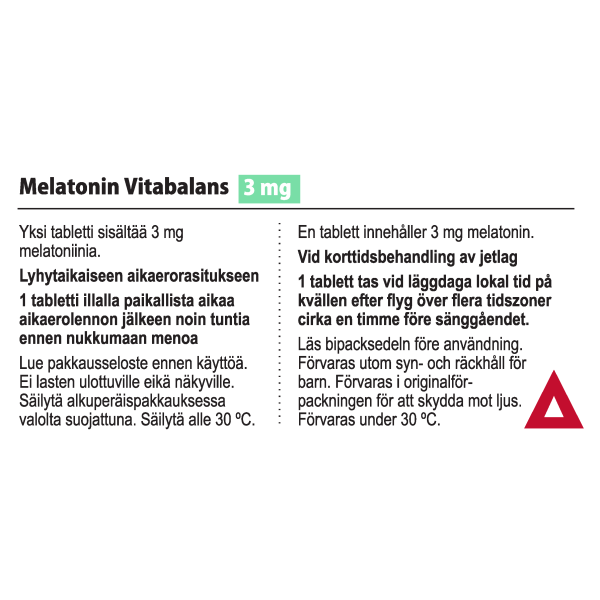 Melatonin Vitabalansin vaikuttava aine, melatoniini, on elimistön luontaisesti tuottama hormoni. Valmiste on tarkoitettu käytettäväksi lyhytaikaisesti aikaerorasitukseen aikuisille eikä sitä saa käyttää muihin käyttötarkoituksiin. Ei alle 18-vuotiaille lapsille.