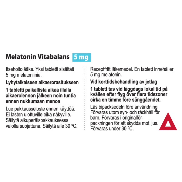 Melatonin Vitabalansin vaikuttava aine, melatoniini, on elimistön luontaisesti tuottama hormoni. Valmiste on tarkoitettu käytettäväksi lyhytaikaisesti aikaerorasitukseen aikuisille eikä sitä saa käyttää muihin käyttötarkoituksiin. Ei alle 18-vuotiaille lapsille.
