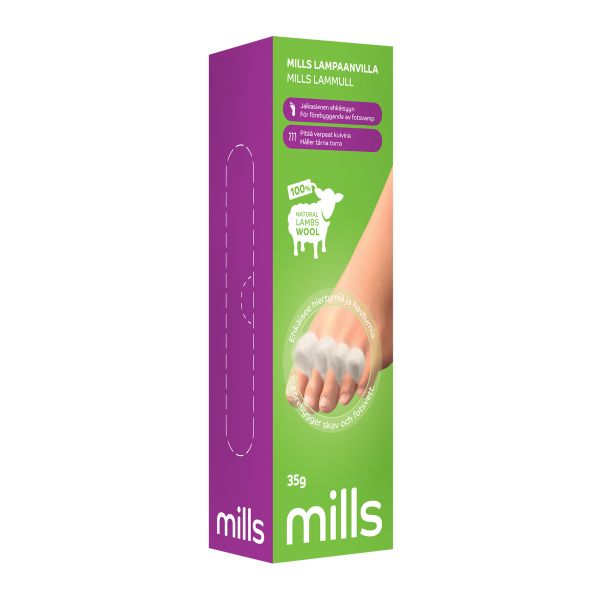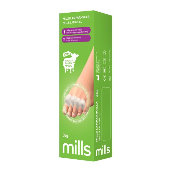Mills Lampaanvilla suojaa ihoa hiertymiltä, estää hautumien syntymistä, edistää hautuneen ihon paranemista, lämmittää palelevia jalkoja ja varpaita ja toimii pehmikkeenä kengässä.