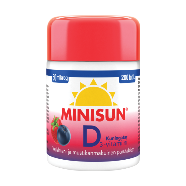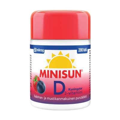 Suomessa kehitetyt Minisun D-vitamiinitabletit ovat helppo tapa varmistaa riittävä D-vitamiinin saanti ympäri vuoden. Minisun 50 mikrog Kuningatar sisältää tehokkaasti imeytyvää D3-vitamiinia. D-vitamiini vahvistaa vastustuskykyä sekä on tärkeä vitamiini luuston, lihasten ja hampaiden hyvinvoinnille. Annostelu on helppoa. Yksi pieni purutabletti päivässä riittää. Minisun 50 mikrog Kuningatar on raikkaan vadelman- ja mustikanmakuinen ja se sopii nuorille, aikuisille ja ikääntyville tehostettuun päivittäiseen käyttöön. Minisun Kuningatar on helppo pureskella, imeskellä tai niellä. Gluteeniton, laktoositon, maidoton, soijaton ja liivatteeton.
