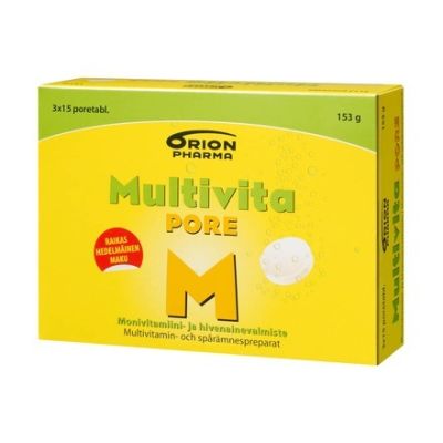 Hedelmäisen appelsiininmakuinen monivitamiini raikkaana porejuomana on hyvä vaihtoehto nieltävälle monivitamiinitabletille. Multivita Pore vastaa vitamiini - ja hivenainekoostumukseltaan Multivita-monitamiinitablettia. Vähäkalorinen -ja suolainen (1 poretabletti sisältää 7,1 Kcal ja 163 mg natriumia). Laktoositon, gluteeniton, hiivaton, sokeriton. Makeutettu aspartaamilla ja asesulfaami K:lla. Ravintolisä.