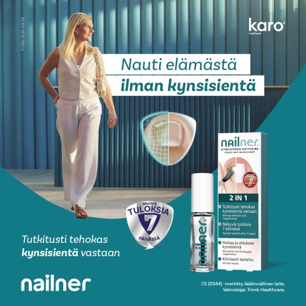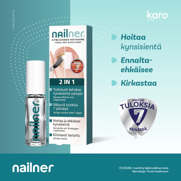 Nailner 2in1 XL Hoitoaineen patentoitu koostumus läpäisee kynnen ja vaikuttavat aineet pääsevät hoitamaan kynsisienitulehdusta syvällä kynnen sisällä. Nailner Hoitoaine 2in1 XL vaikuttaa paikallisesti ja sillä ei ole haittavaikutuksia.