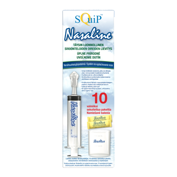 Nasaline-nenähuuhtelijalla voidaan helposti huuhdella koko nenä puhtaaksi suolavedellä. Huuhtelija poistaa siitepölyn, liiallisen liman sekä pöly- ja nokihiukkaset. Ärsytys nenässä vähenee ja limakalvot kostuvat uudelleen. Pakkaus sisältää Nasaline-nenähuuhtelijan, säilytys-/matkakotelon, 10 suola-annospussia ja käyttöohjeet.