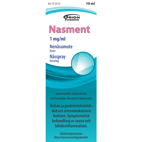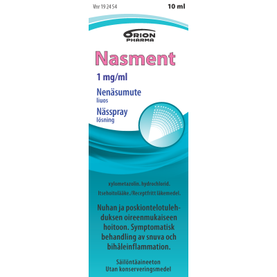 Nasment 1 mg/ml nenäsumute 10 ml on ksylometatsoliinia sisältävä lääke nuhan tai poskiontelotulehduksen yhteydessä ilmenevän nenän tukkoisuuden oireenmukaiseen, tilapäiseen hoitoon. Se annostellaan suihkeena enintään kolme kertaa vuorokaudessa enintään 10 vuorokauden ajan. Nasment sisältää mentolia. Lääke on tarkoitettu 12 vuotta täyttäneille ja sitä vanhemmille käyttäjille.