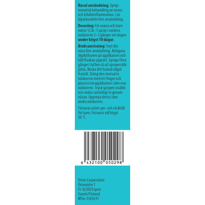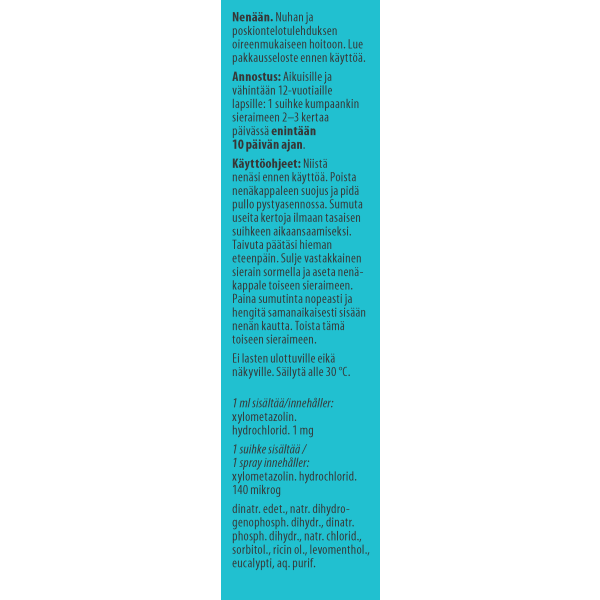 1 suihke tarvittaessa molempiin sieraimiin enintään 3 kertaa vuorokaudessa enintään 10 vuorokauden ajan. Lääkettä ei pidä käyttää enempää kuin 3 kertaa päivässä kumpaankaan sieraimeen.