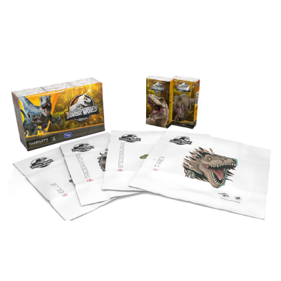 Jännillä Jurassic World -aiheilla kuvioituja nenäliinoja. Tuote sisältää 6 klassista taskupakkausta, joissa kussakin on 9 nenäliinaa. Nenäliinoissa kevyt vaniljan tuoksu.