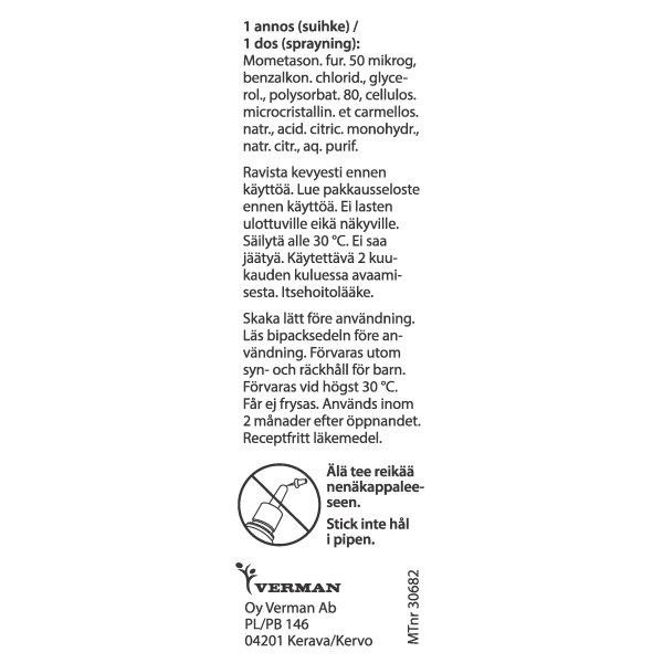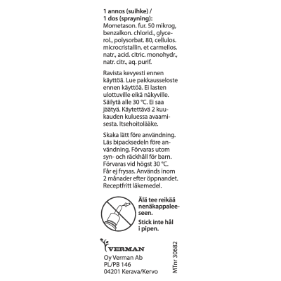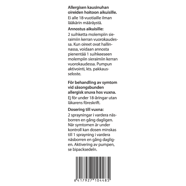Itsehoidossa yli 18-vuotiaille aikuisille kaksi suihketta kumpaankin sieraimeen kerran vuorokaudessa. Kun oireet ovat hallinnassa, voidaan annosta pienentää yhteen suihkeeseen kumpaankin sieraimeen kerran vuorokaudessa.