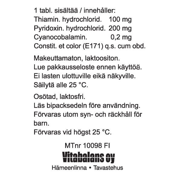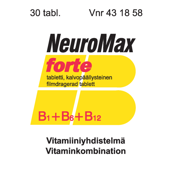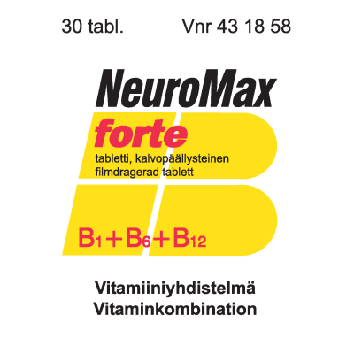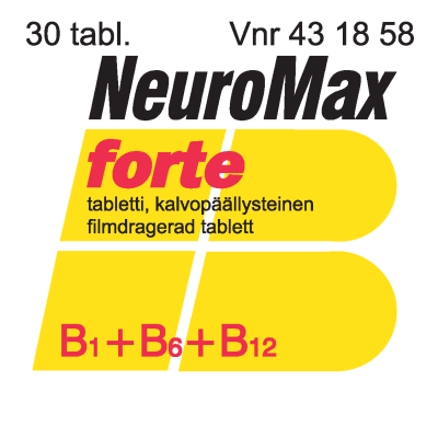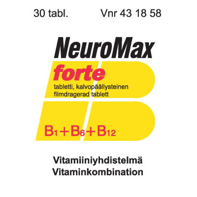 Neuromax forte-tabletit sisältävät 100 mg tiamiinia (B1), 200 mg pyridoksiinia (B6) ja 0,2 mg syanokobolamiinia (B12-vitamiini). Valmistetta käytetään B-vitamiinien puutostilojen ehkäisyyn ja hoitoon. B-vitamiineilla on moninaisia tärkeitä tehtäviä elimistön aineenvaihdunnassa. Lapsille ja jatkuvaan käyttöön vain lääkärin ohjeen mukaan.