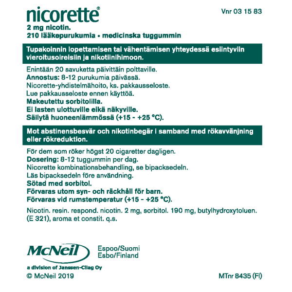 Nicorette®-purukumi sisältää nikotiinia, joka vapautuu suun limakalvojen kautta elimistöön ja helpottaa vieroitusoireita.