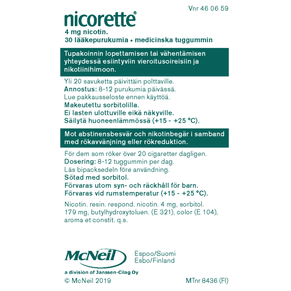 Nicorette®-purukumi sisältää nikotiinia, joka vapautuu suun limakalvojen kautta elimistöön ja helpottaa vieroitusoireita.