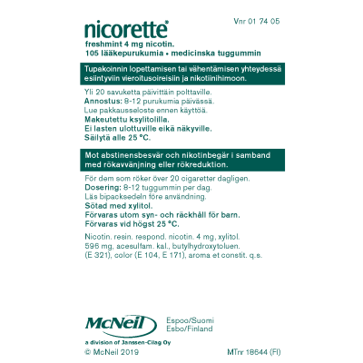 Tupakoinnin lopettamisen tukihoito. Lääke on itsehoidossa tarkoitettu yli 18-vuotiaille.