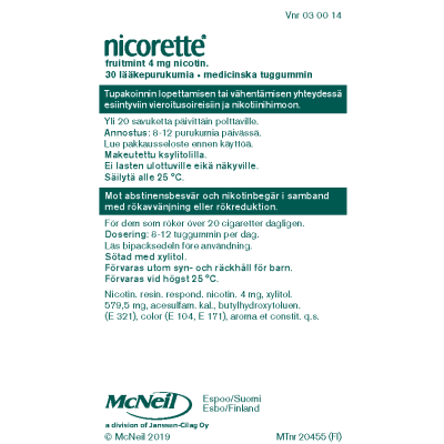 Nicorette®-purukumi sisältää nikotiinia, joka vapautuu suun limakalvojen kautta elimistöön ja helpottaa vieroitusoireita.