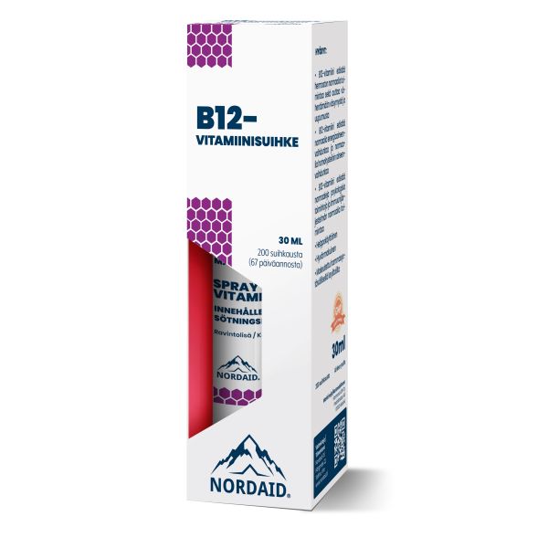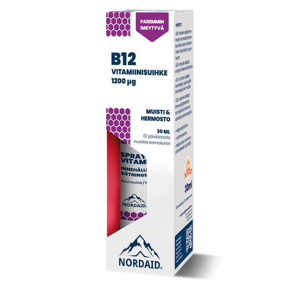 Nordaidin B12-vitamiinisuihke on suoraan suun limakalvoilta imeytyvä, helppokäyttöinen ja hyvänmakuinen ravintolisä hermoston normaalin toiminnan, energia-aineenvaihdunnan ja vireyden tueksi.