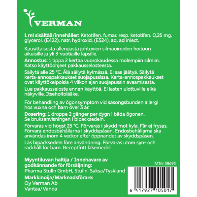 Lääkettä käytetään lievittämään silmien kausittaisen allergisen sidekalvontulehduksen oireita. Ei alle 3-vuotiaille lapsille.