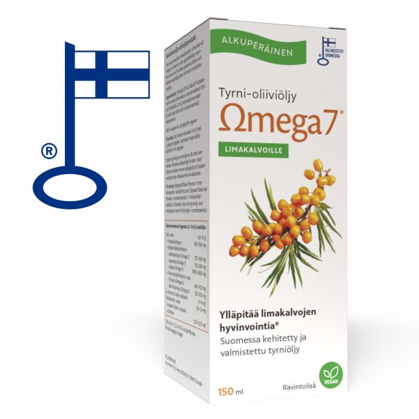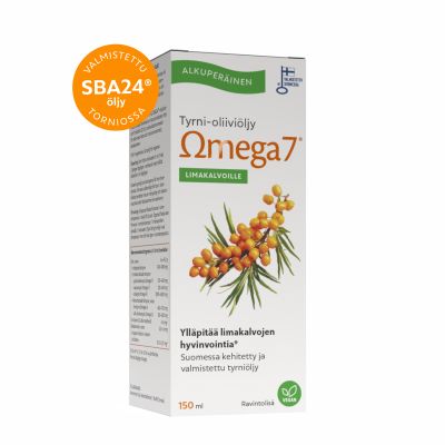 Den unika SBA24®-havtornsoljan innehåller både havtorns bär- och fröolja. På så sätt får slemhinnor och hud viktiga omega-3, -6, -7 och -9-fettsyror i optimala proportioner. SBA24®-havtornsoljans tillräckliga och standardiserade nivåer av A- och E-vitaminer säkerställer produktens effektivitet. Vår kropp omvandlar havtornsoljans betakaroten till A-vitamin, vilket upprätthåller slemhinnornas och hudens välbefinnande. Hälsopåverkan av SBA24®-havtornsolja, utvecklad och tillverkad i Finland, har studerats i flera vetenskapliga forskningsprojekt. Passar för torra slemhinnor i munnen och intima områden samt för torr, irriterad och åldrande hud. Effekterna märks vanligtvis efter 2-5 veckors regelbunden användning. Nyckelband.