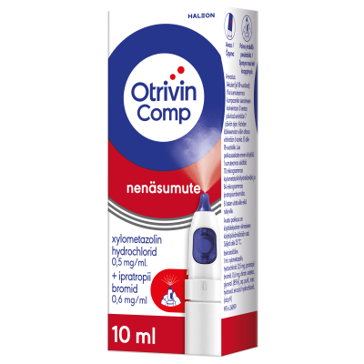 Otrivin Comp on yhdistelmävalmiste, jossa on kaksi vaikuttavaa ainetta. Ksylometatsoliini avaa tukkoisen nenän supistamalla nenän limakalvojen verisuonia ja ipratropiumbromidi hoitaa vuotavaa nuhaa vähentämällä liman muodostumista nenän limakalvolla. Vaikuttaa 5-15 minuutissa ja vaikutus kestää noin 6-8 tuntia. Säilytysaineeton.