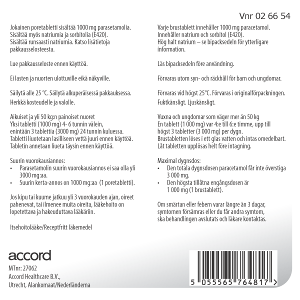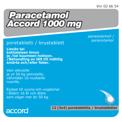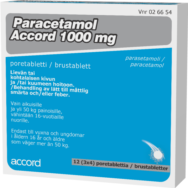 Paracetamol Accord -poretablettien vaikuttava aine on parasetamoli ja niitä käytetään aikuisilla ja vähintään 16-vuotiailla nuorilla tilapäisten särky- ja kuumetilojen yhteydessä alentamaan kuumetta ja lievittämään kipua.