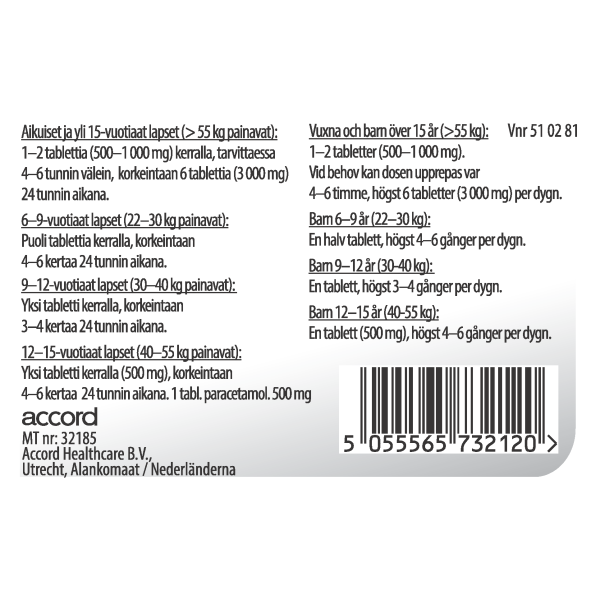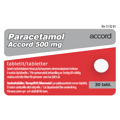 Paracetamol Accord -tablettien vaikuttava aine on parasetamoli ja sitä käytetään kivun lievitykseen ja kuumeen alentamiseen aikuisilla ja nuorilla. Ei alle 6-vuotiaille lapsille.
